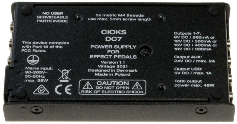 Since 1991, the Danish company CIOKS has been providing guitar and bass players with reliable power supplies dedicated for effect pedals. After more than a quarter of a century, CIOKS has designed the next Future Power Generation professional power supply dedicated to powering up to seven high current pedals (as well as others with lower current draw) alongside providing power for a smartphone or a tablet via the USB outlet and having a 24V DC auxiliary outlet. The result is CIOKS DC7. Features • Trim 1-inch profile (25,4mm), only 0,5kg (1.1 lb) • 2-stage switch-mode power supply topology • Ultra-low noise achieved by multi-stage filtering • 7 isolated DC-outlets, 6W each (660mA at 9V on each outlet) • 4 selectable voltages on each outlet (9, 12, 15 or 18V) • Charge your phone or tablet with 5V USB outlet (max. 1A) • Expand via 24V AUX outlet with CIOKS 8 or CIOKS 4 units for more isolated outlets • Individual status LED on each outlet and global status LED • Built-in true power meter showing the total load • Total maximum output power 48W • Use anywhere in the world, universal mains input voltage 90-265V AC • Mounting hardware for Pedaltrain and Temple Audio boards included • Compatible with CIOKS GRIP for drill-free Pedaltrain mounting • 12 Flex cables included • Designed in Denmark, assembled in Poland • 5-year worldwide warranty