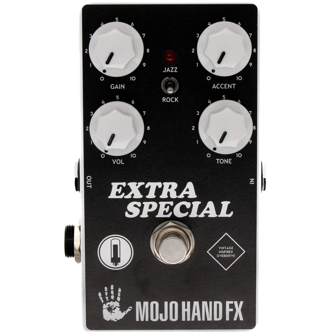 Controls include the standard Volume, Gain, and Tone knobs, along with an Accent knob that acts much like a Presence or Contour control. It also features a 2-way toggle for Jazz or Rock voicings. Like all Mojo Hand FX pedals, it comes in a sturdy, die-cast aluminum enclosure with true bypass switching, powder-coated finish, and UV printed artwork.
